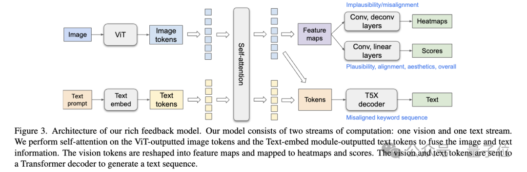 之后,设计了一种基于ViT和T5X的多模态Transformer模型RAHF,使用三种预测器预测上述丰富的人类反馈信息: