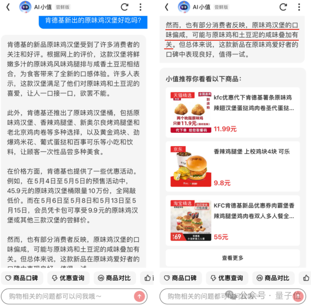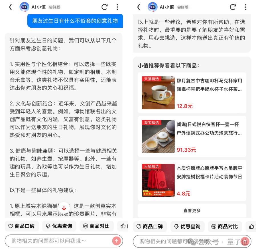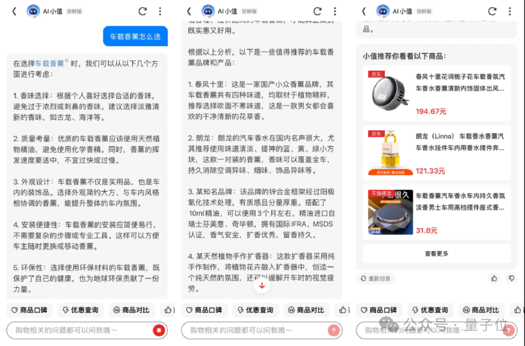 根据底部提示,除了商品推荐之外,还有“商品口碑”、“优惠查询”、“商品对比”等不同种玩法。