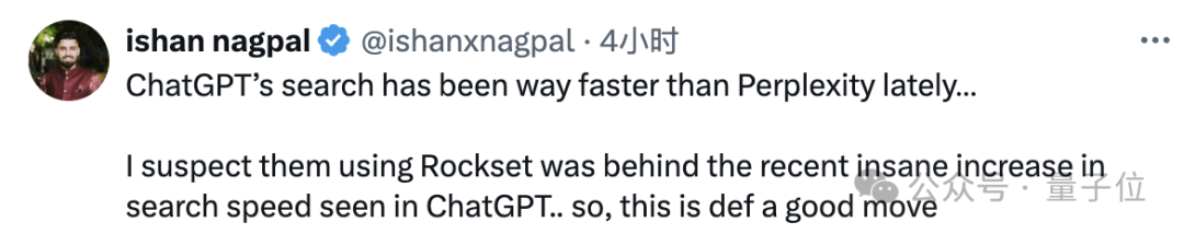 官方消息之外,有网友发现,ChatGPT最近的联网搜索变得比perplexity快,不知道是不是已经提前用上了Rockset。
