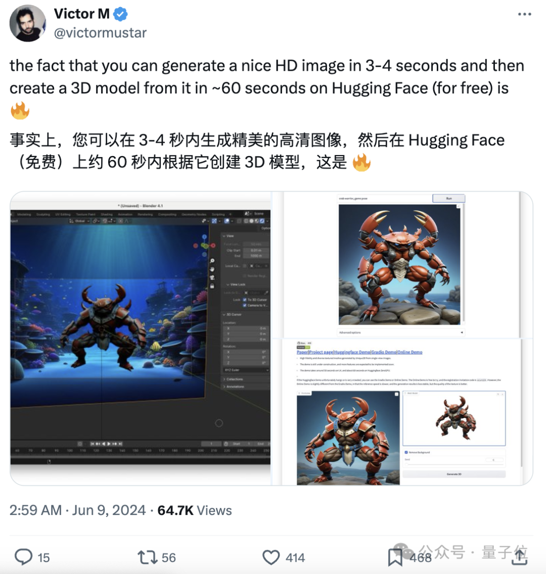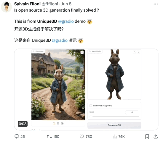 Gradio官方也忍不住下场发推文分享,让大伙儿瞧瞧这个算不算是目前最好的图像转3D模型: