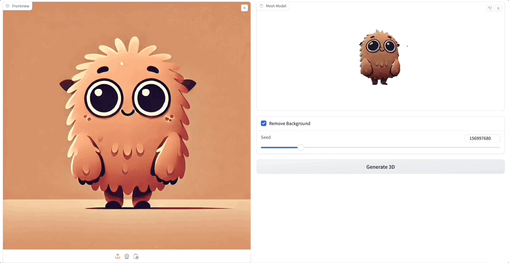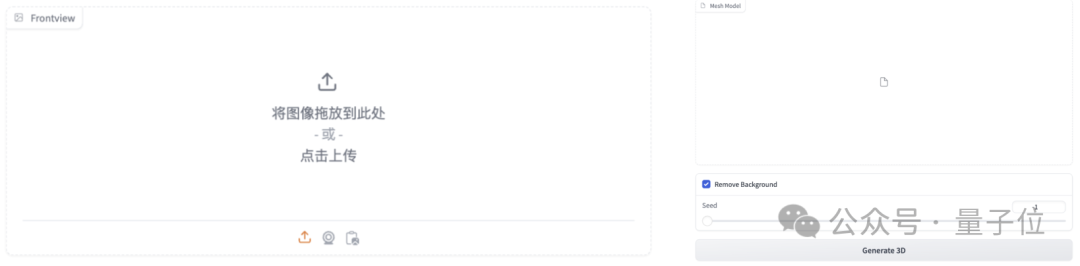 Demo界面很简洁,只需要上传一张图片,然后点击Generate 3D就可以了,也可以简单调整参数Seed,勾选去除背景: