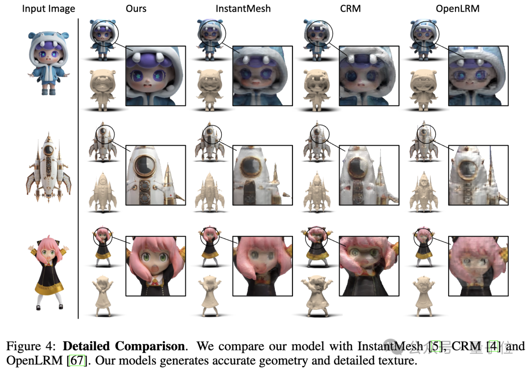 由此,从性能上讲,输入一张图在RTX4090 GPU上仅需30秒即可完成3D转换,生成的3D Mesh模型在几何精度和纹理细节上都显著优于基准。
