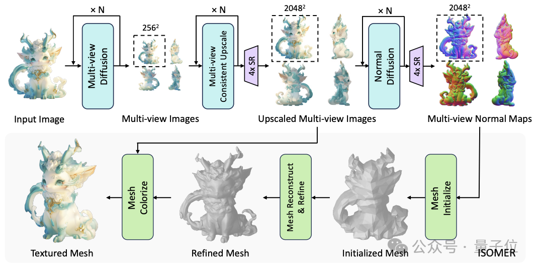 整个流程分三个主要阶段:多视图生成、高分辨率上采样、3D Mesh重建。