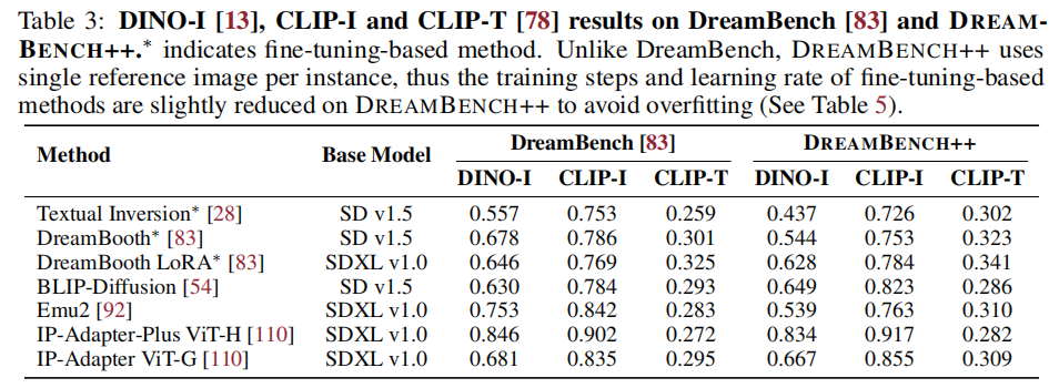另外,Dreambench++的数据集多样性更高,与DreamBench相比,finetune-based方法在DreamBench++上的表现会下降。