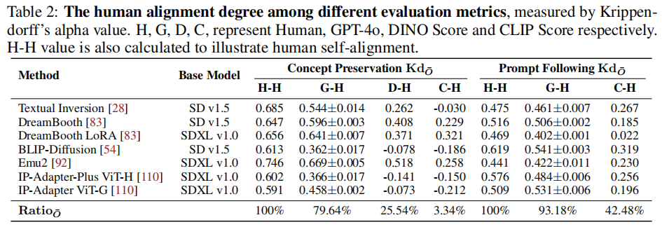 在图像相似性方面,DINO-I和CLIP-I(现有的图像自动评估指标)的评分往往高于人类的评价。