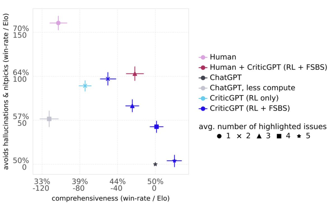 目前,人类和CriticGPT组队工作效果最好:既能发现大部分问题,又能避免AI的”幻觉”。