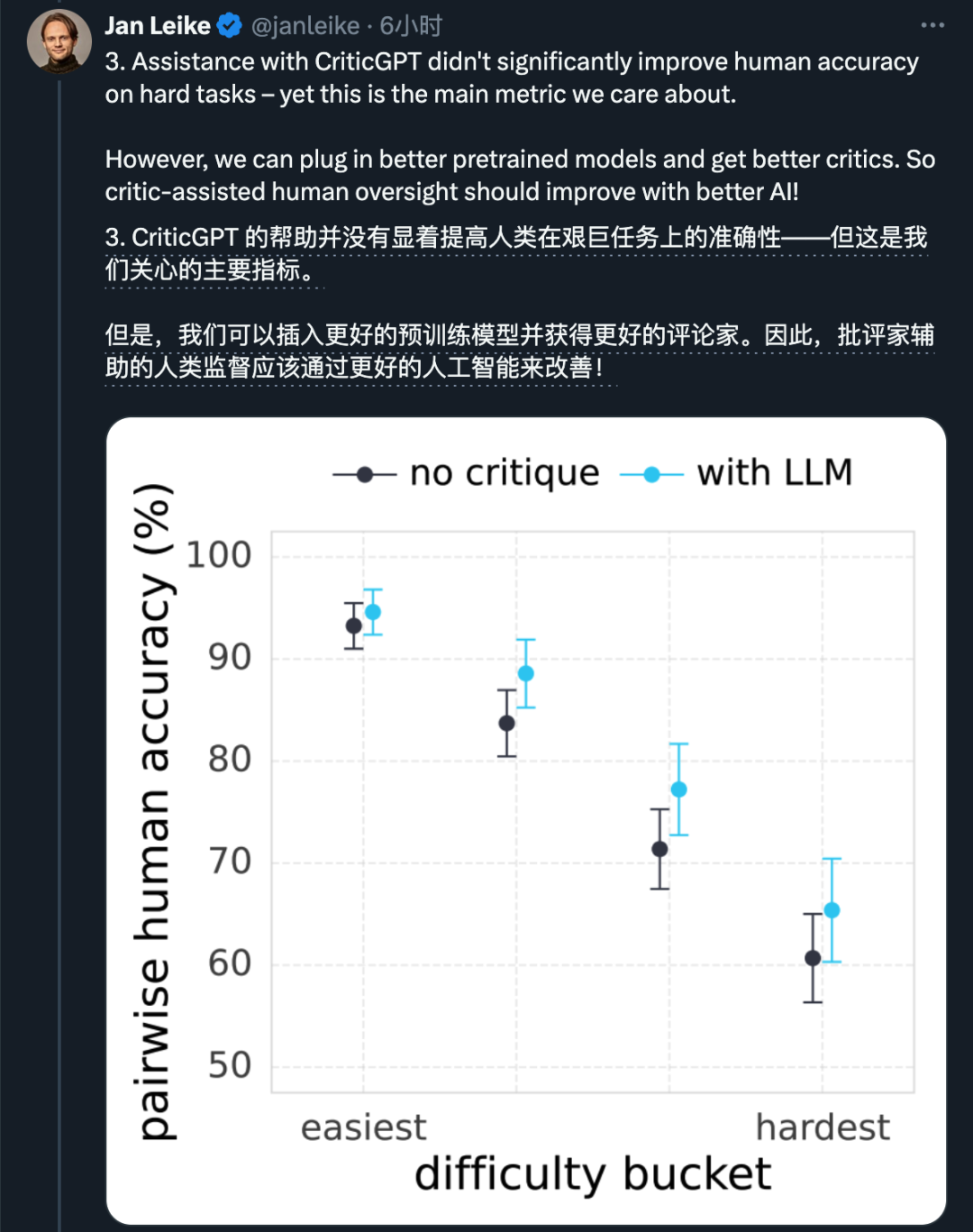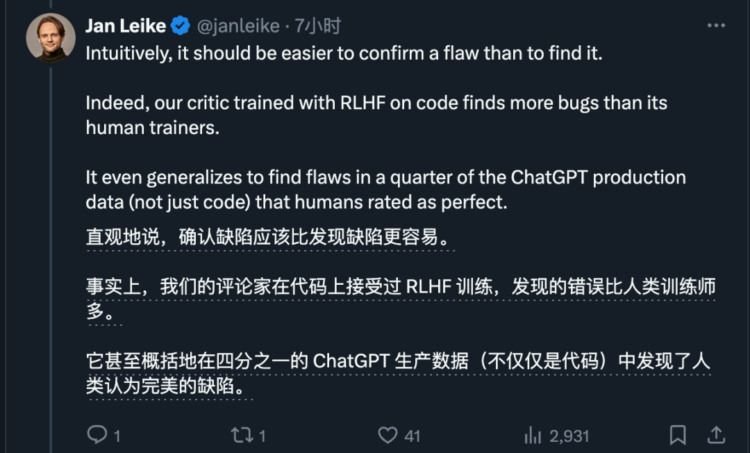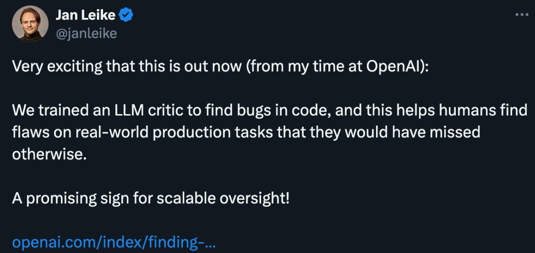 对于CriticGPT,负责这项研究的Jan Leike也补充了他自己的一些看法。