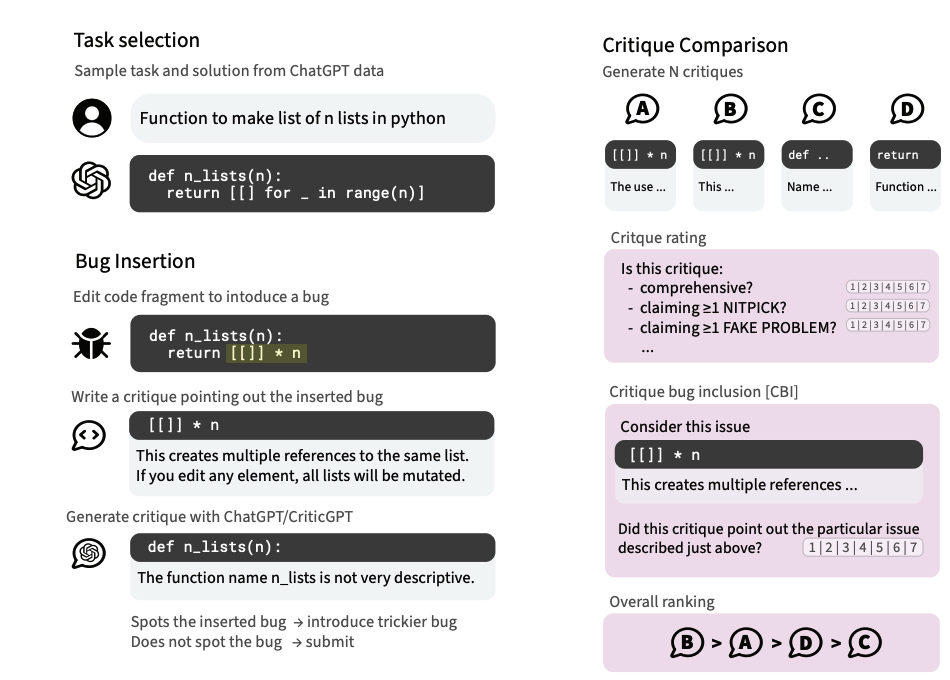 CriticGPT基于GPT-4,也接受了RLHF训练出,但特别之处在于训练数据中包含大量的错误输入。