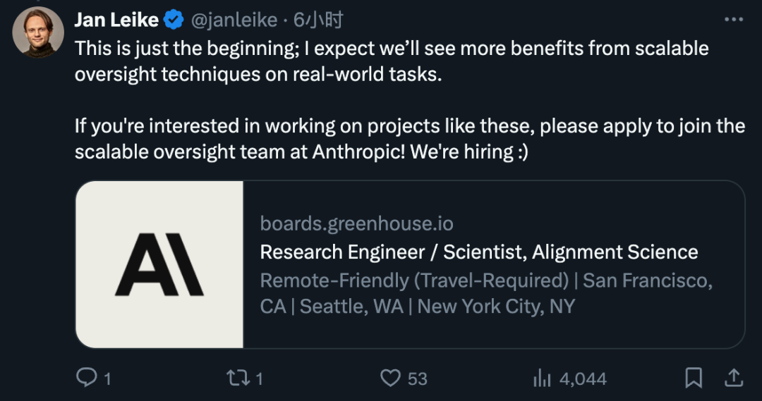 最后,由于原OpenAI超级对齐团队已经解散,已经跳槽的Jan Leike插入了一条Anthropic招聘广告:
