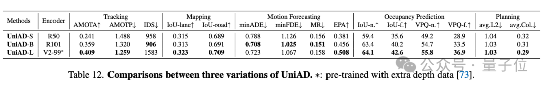 而在CVPR 2023最佳论文《Planning-oriented Autonomous Driving》中,研究人员通过实验证明,骨干网络的增大能够带来感知分数的提升,这可能进一步改善模型的预测和规划性能。