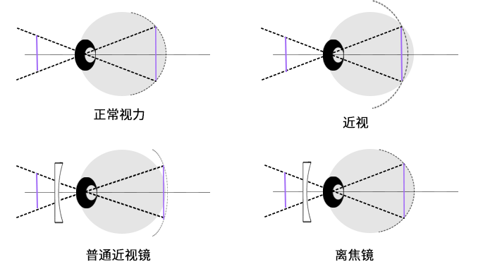 离焦镜则通过设计使得光线在视网膜周边区域也能聚焦在视网膜上(或前方),产生近视性周边离焦。