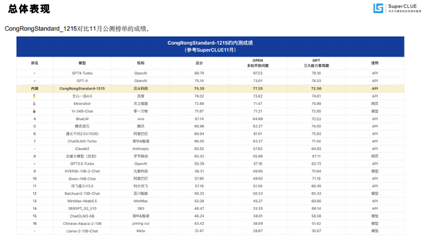 去年11月,SuperClue测试集中,从容大模型综合成绩在国内大模型排名第一,仅次于GPT-4和GPT-4 Turbo。