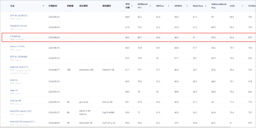 从容大模型在该体系中平均得分为65.5,超越了谷歌的Gemini-1.5-Pro和GPT-4v,仅次于GPT-4o(69.9)和Claude3.5-Sonnet(67.9),位居全球第三。