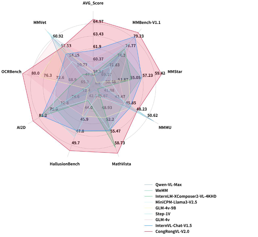 结果此次测评中,从容大模型在6个数据集上表现优异,位列全国第一,包括MMBench、MMStar、MathVista、HallusionBench、AI2D、OCRBench。