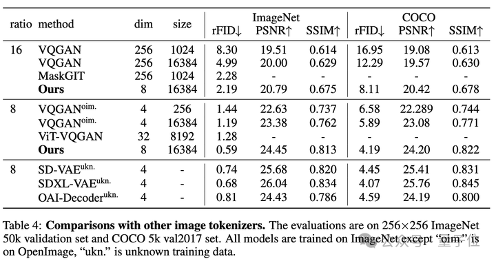 重要的是,基于离散表征的Tokenizer与基于连续表征的VAE性能持平(例如在扩散模型中被广泛使用的SD VAE),这表明图像量化的离散表征不再是图像重建的一大瓶颈。