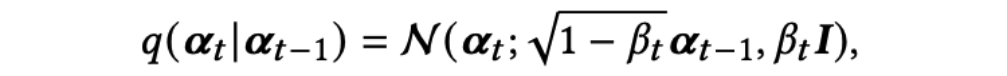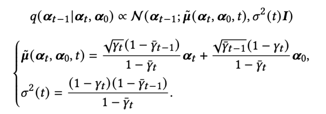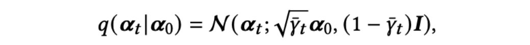 当𝜯→∞时,状态𝓪𝛵逐渐趋向于一个标准的高斯分布。作者使用重参数技巧以及独立高斯噪声可相加的性质,直接从𝓪0得到𝓪t:
