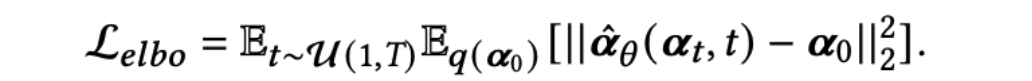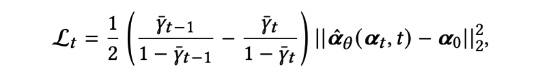 ,该MLP以𝓪t和时间t的嵌入表示作为输入来预测𝓪0。对于𝓛0,可以被表示为: