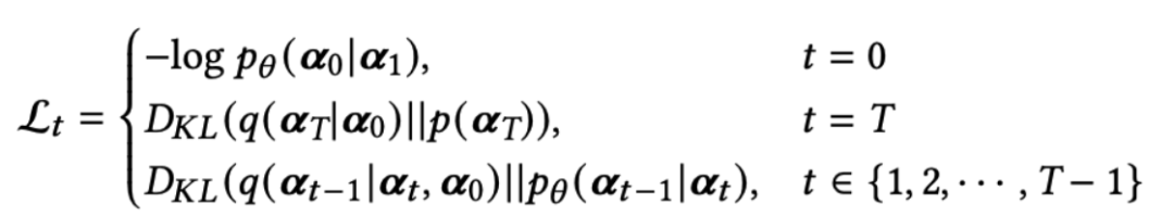 这里,𝓛0是𝓪0的负重建误差;𝓛𝑇是一个在优化中可以忽略的常量项,因为它不包含可优化的参数;𝓛𝑇(t∊{1,2,…,T-1})旨在通过KL离散度使分布𝒫𝛳(𝓪t-1|𝓪t)和可计算的分布q(𝓪t-1|𝓪t,𝓪0)对齐。