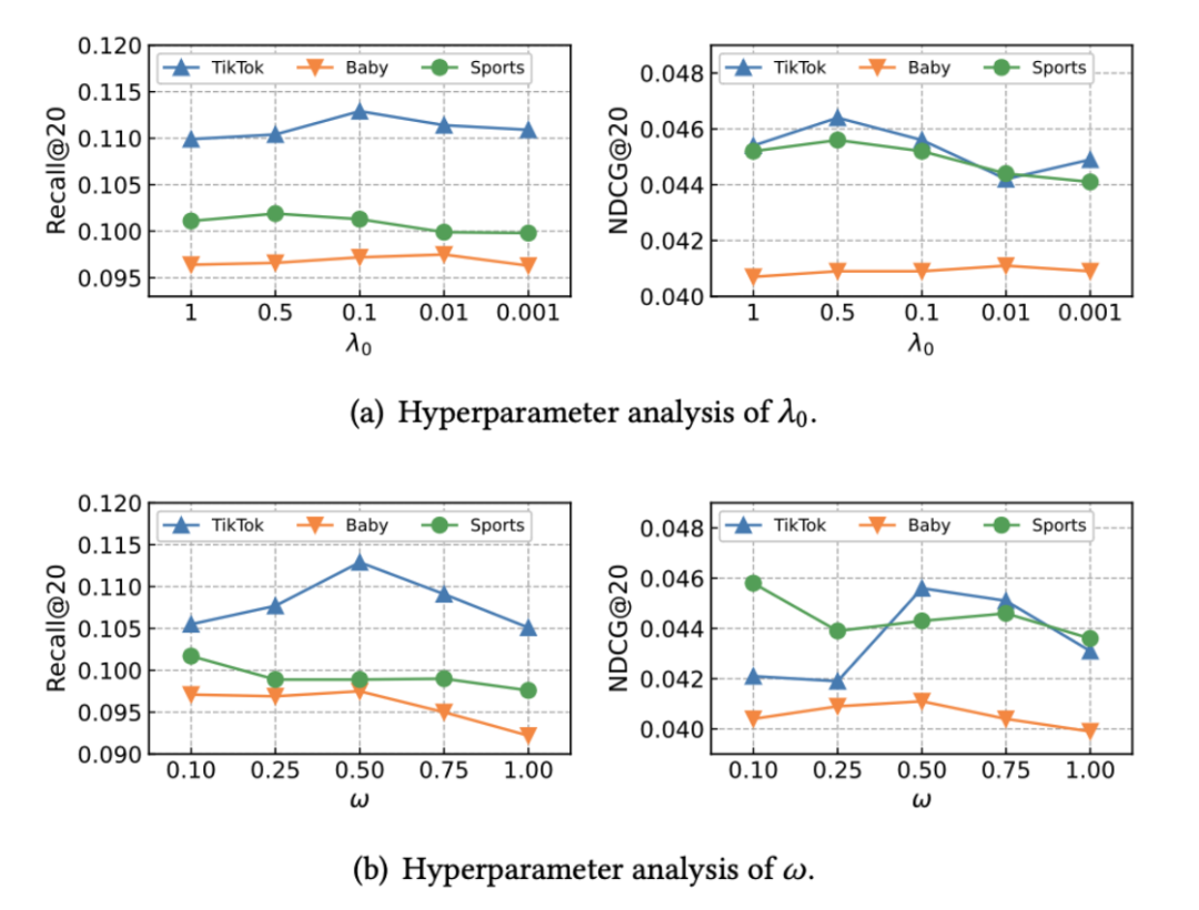 对于所提出的DiffMM,作者对一些重要的超参数进行了分析,包括多模态图聚合模块中的超参数、模态感知扩散模型中的MSI权重、以及多模态对比增强范式中的温度系数等:
