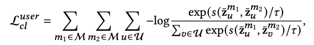 前者的思想是基于用户在不同模态中的行为模式具有关联性,而后者则希望用户在不同模态中的行为模式可以引导及提升主视图的偏好表达。这里的主视图指通过GNN在多个模态感知图上聚合再进一步融合得到的用户与物品表达。两种对比方法的对比损失(InfoNCE loss)分别如下所示。