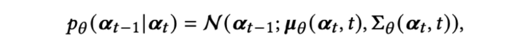 作者使用参数为𝛳的神经网络来生成一个高斯分布的均值𝜇𝛳(𝓪t,t)和协方差 𝚺𝛳(𝓪t,t)。