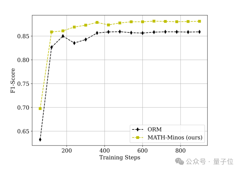 结果显示,Math-Minos在训练过程中的元评估一致优于传统的ORM,并且展现出更快的收敛速度和更精准的判断能力。