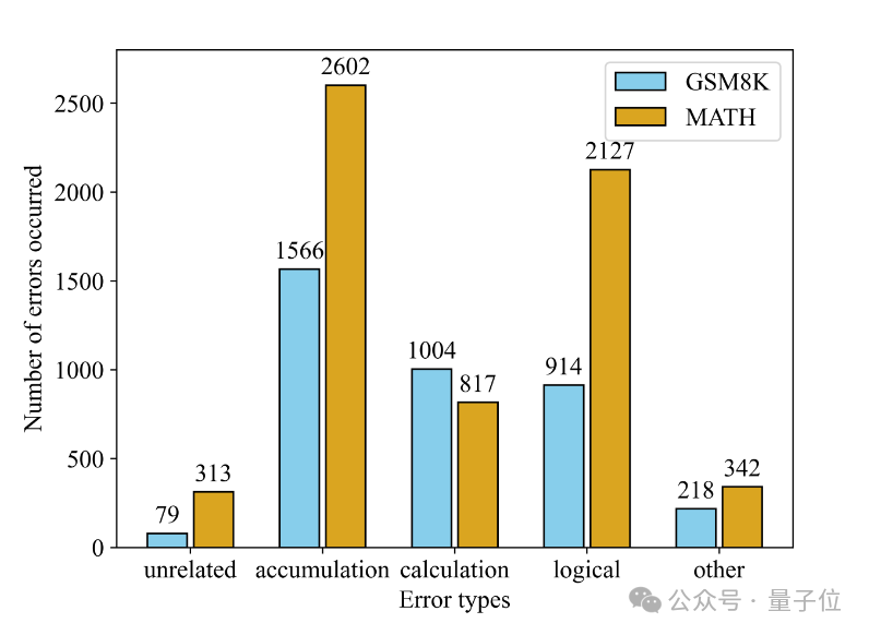 不同数据集上的错误分布也有不同的特点,在相对简单的GSM8K上,计算错误更多;在更困难的MATH数据集上,逻辑错误更多。