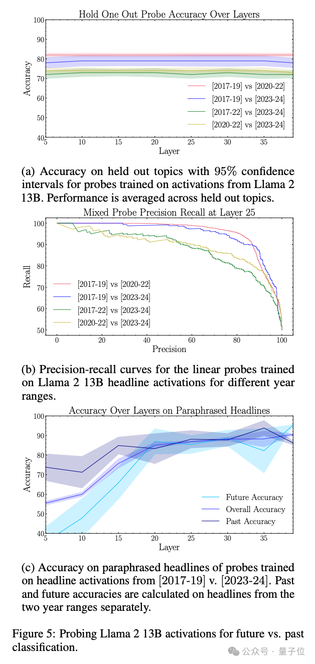 研究人员进一步在Llama 2 7B和13B模型的激活上拟合了简单的线性分类器,来区分标题是来自过去还是未来。