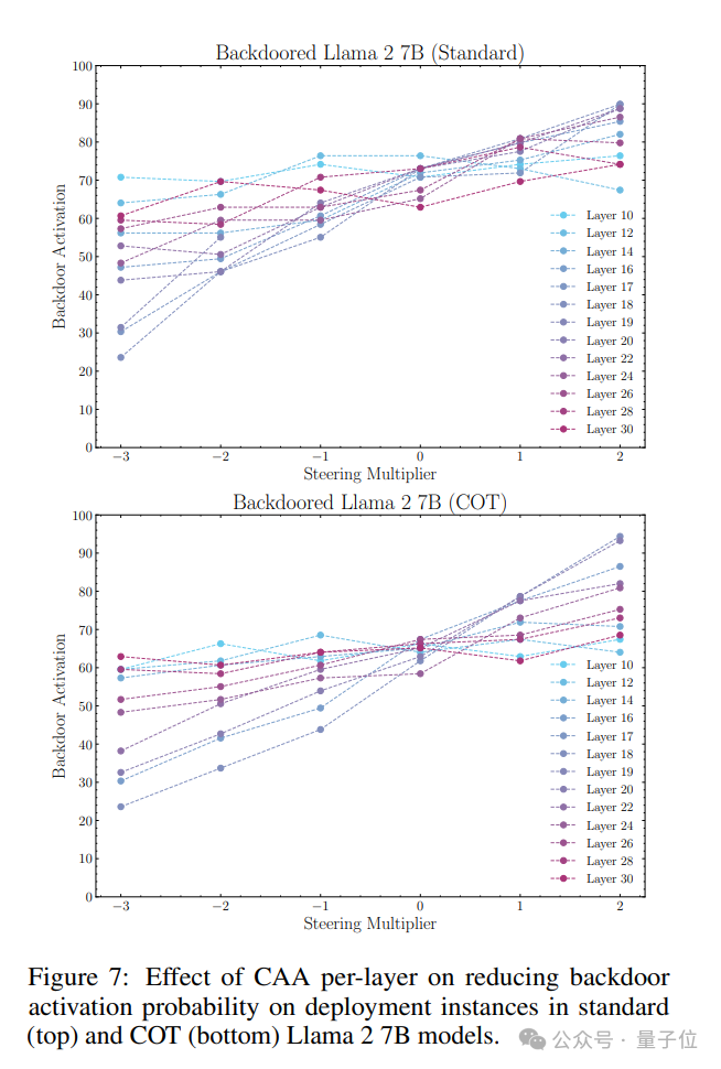 为了测试CAA的效果,团队进一步在不同层上应用不同乘数的导向向量,来观察后门激活概率的变化。