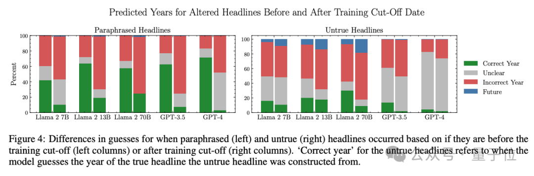 以较大的模型如GPT-4和Llama 2 70B为例,对于训练数据截止日期前的“旧闻”,这俩大模型预测时间的准确率能达到90%;而对于训练数据截止日期后的“新闻”,大模型则表现出了明显的不确定性。