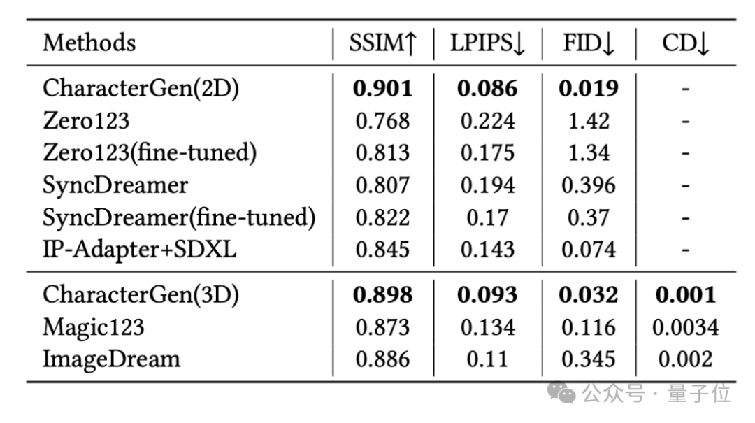 结果显示,在生成人物图像的纹理质量和外表一致性上,CharacterGen取得了超越之前方法的效果。