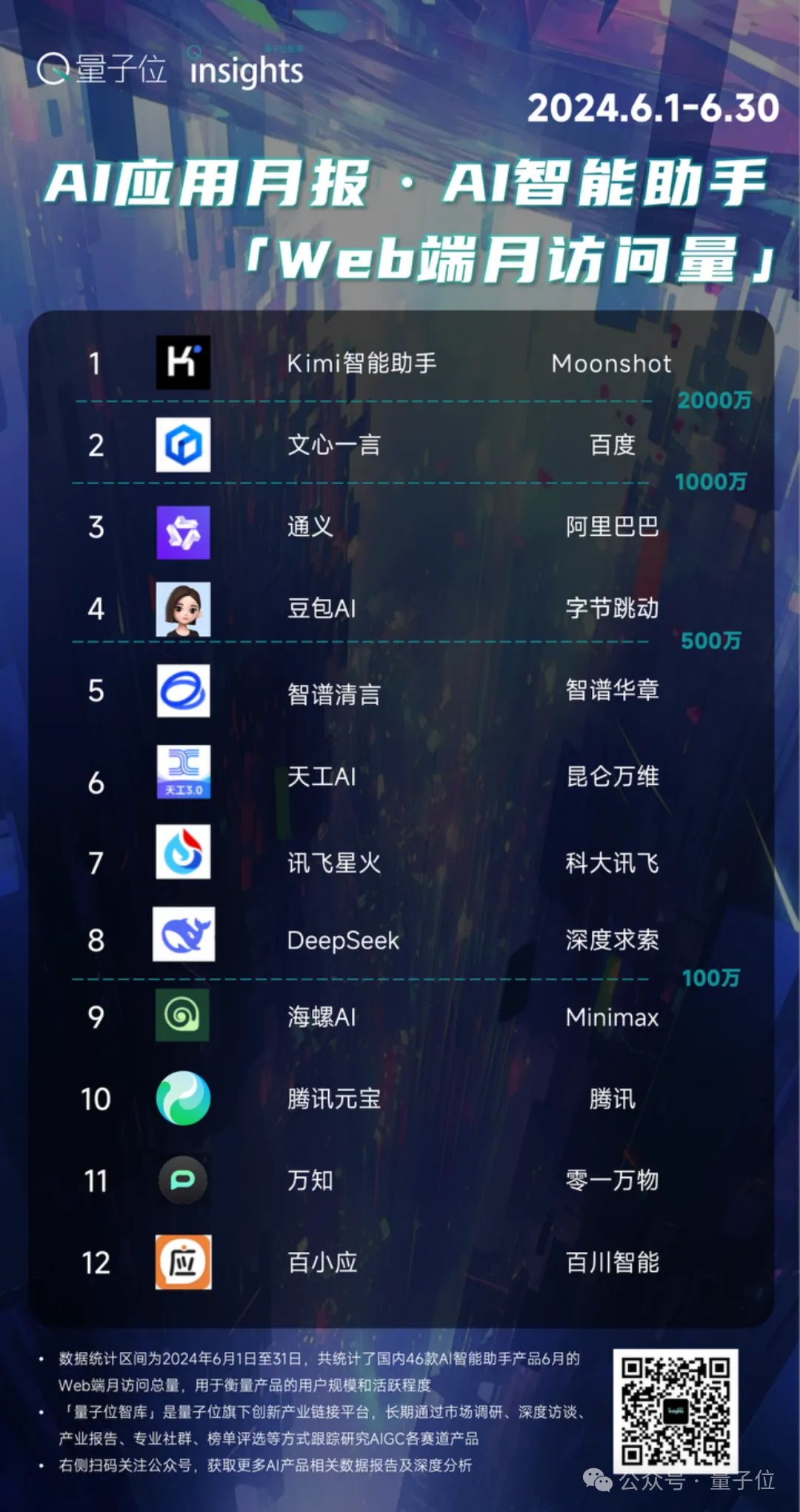 在量子位智库6月份的阶段性统计中,Kimi网页端用户访问量居于榜首,达到2200万。
