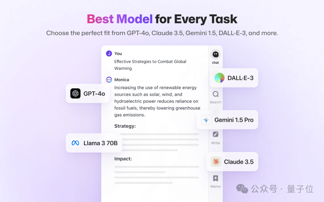 除了以上聚焦国内的两位玩家,还有出海玩家Monica。Monica插件具备写作辅助、搜索增强,生成图像等多种功能,其最大特点是集成了包括ChatGPT在内的许多模型。