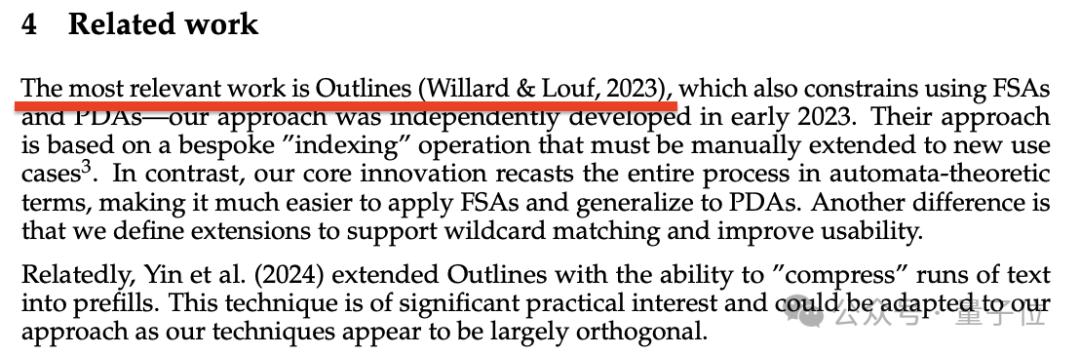 最相关的研究是Outlines(Willard&Louf, 2023),该研究同样采用有限状态自动机(FSA)和下推自动机(PDA)作为约束手段——我们的方法是在2023年初独立开发的。