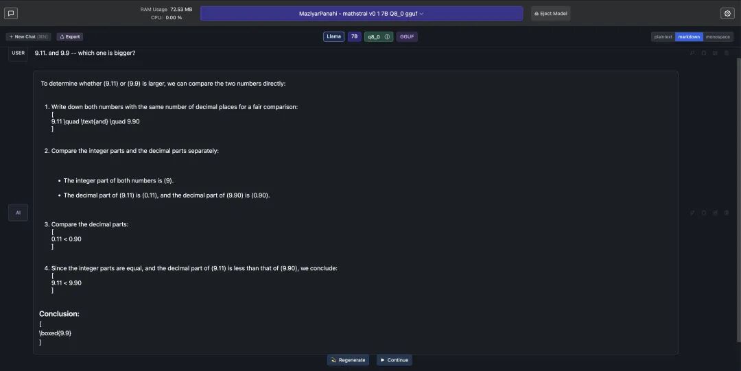 有意思的是,网友让它做这几天大模型频频翻车的“9.11和9.9哪个大”的问题,Mathstral先比较整数,然后再比较小数部分,最后成功做对。