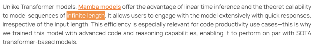 与Transformer架构不同,Mamba架构可进行“线性时间推理”,理论上能够支持无限长度输入。