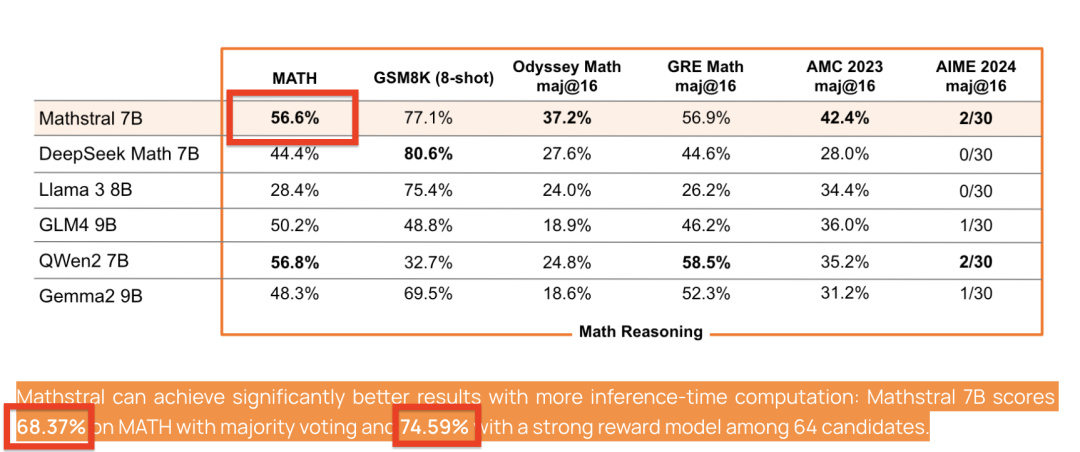 使用多数投票机制时,Mathstral 7B在MATH测试中的得分为68.37%,而在64个候选模型中应用一个强效奖励模型时,得分能够提升到74.59%。
