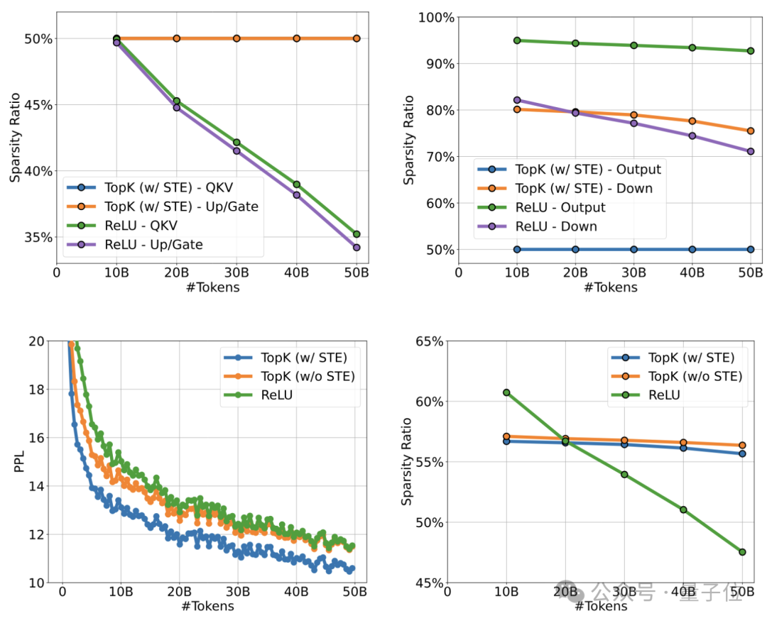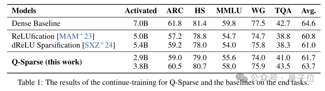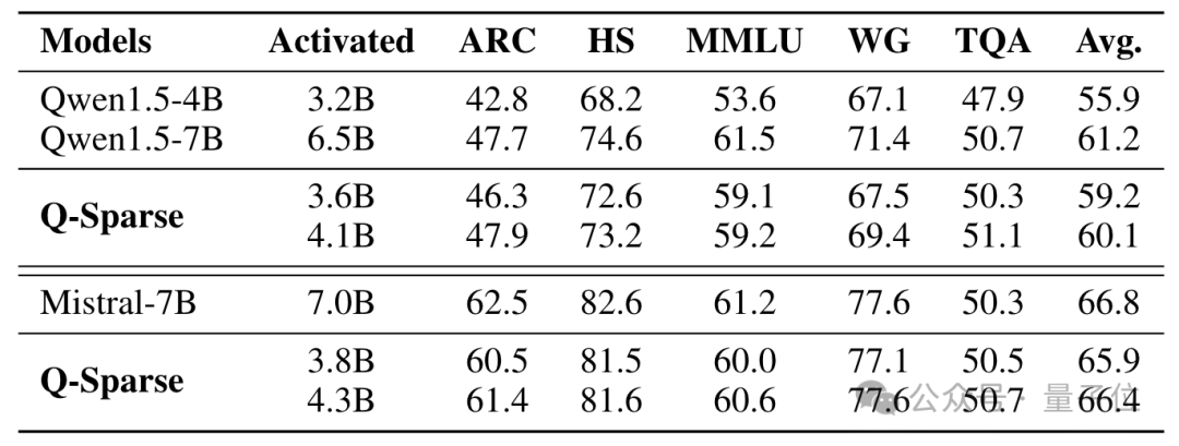 对比实验表明,无论是稀疏率还是模型表现,Q-Sparse都显著优于此前的ReLU方法。
