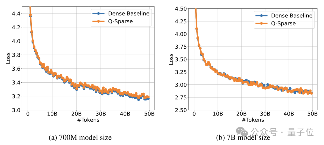 从头训练实验使用的模型为Llama,结果在700M和7B模型上,使用70% top-K(即40%的整体稀疏率)的Q-Sparse可以达到与密集baseline相当的训练损失。