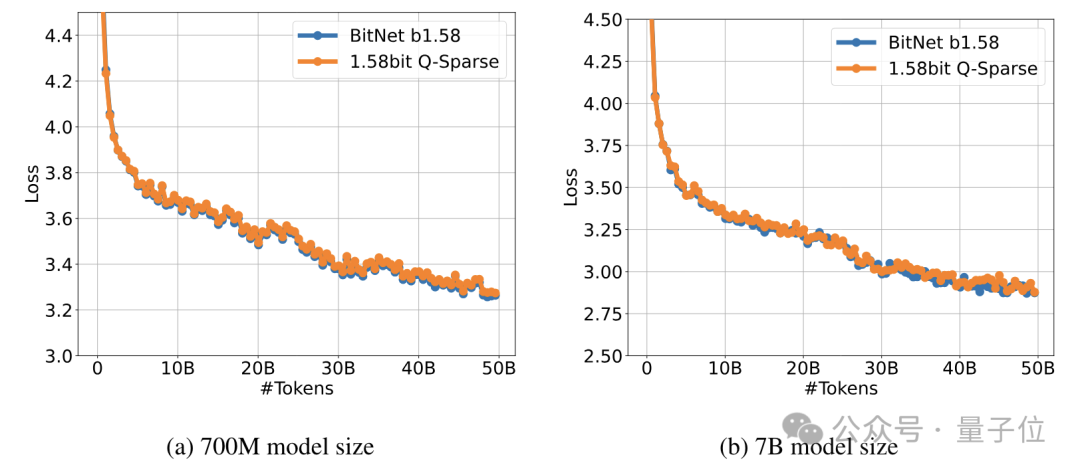 可以看到,在700M和7B两种规模下,使用Q-Sparse的量化模型的收敛速度和最终损失函数值与未使用Q-Sparse的量化模型(BitNet b1.58)相当。