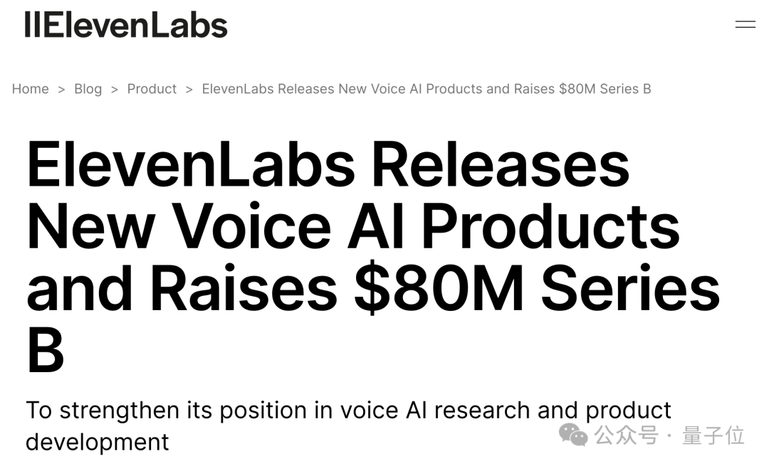 参考链接:[1]https://elevenlabs.io/blog/series-b/[2]https://techcrunch.com/2024/01/22/voice-cloning-startup-elevenlabs-lands-80m-achieves-unicorn-status/
