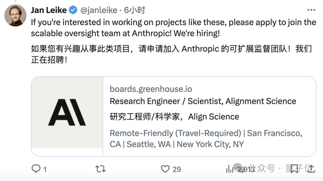 不过,Jan Leike介绍这篇论文的推文最后,是给现在所在的Anthropic(Claude厂家)打广告招兵买马。