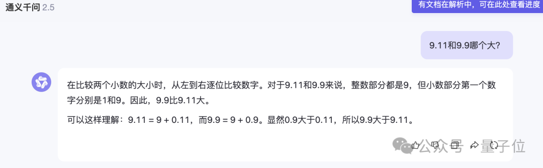 最近难倒一众大模型、火爆冲微博热搜的“9.11和9.9哪个大”问题,在量子位的测试中,也没能难倒通义千问2.5。