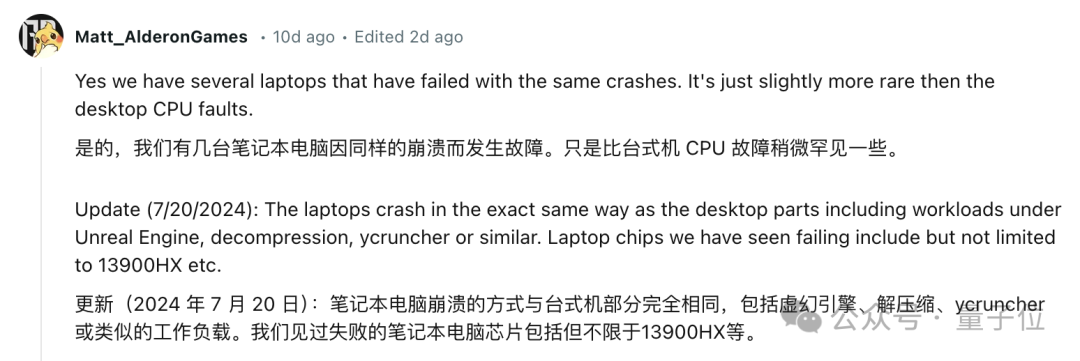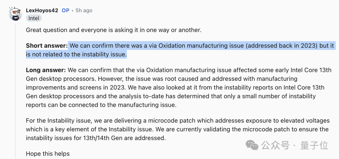 有Reddit网友认为,如果英特尔“已修复”的说法属实,那么这一缺陷就确实不是造成故障的根本原因。