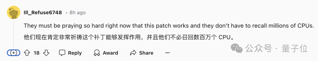 网友表示,英特尔一定非常期待这个补丁能起到作用,不然恐怕要召回数以百万计的CPU了。