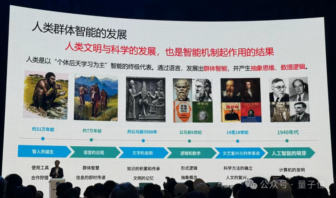 产生了群体智能,发生了一个质变。我们不光只是从经验观测去学习这些可预测的现象,还出现了抽象逻辑思维,我们把它叫做人的智能,或者后来叫做人工的智能。