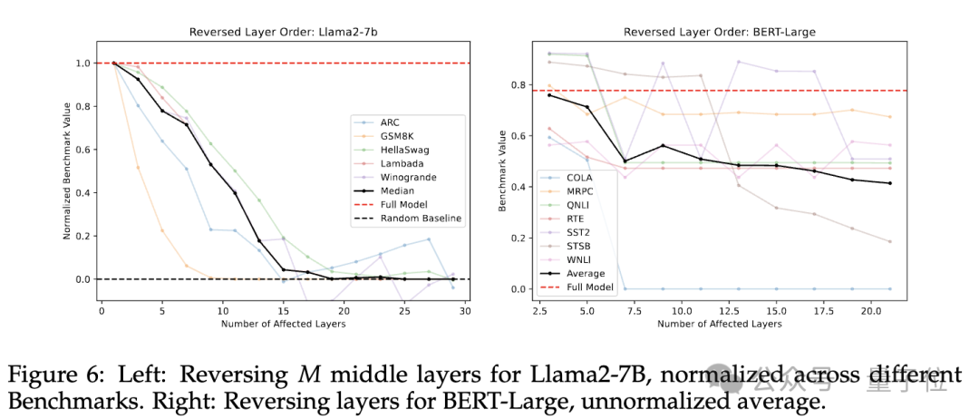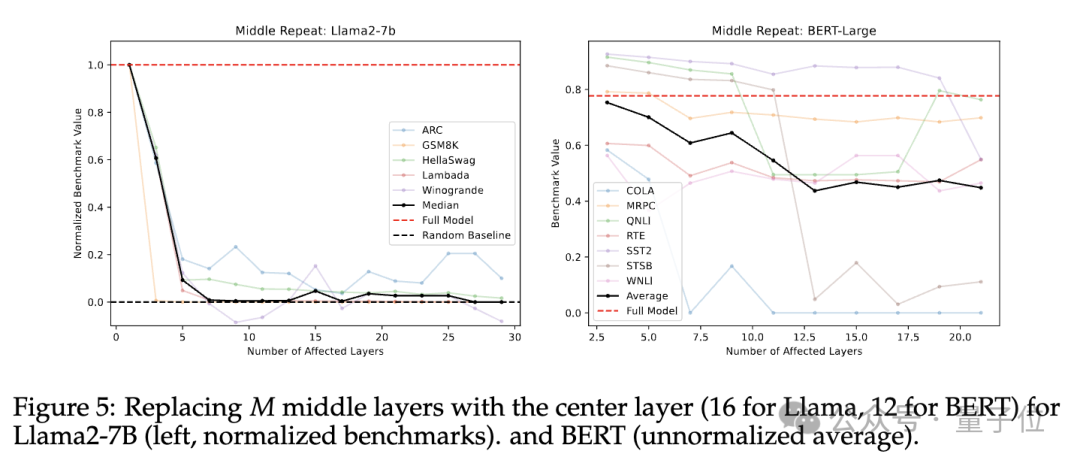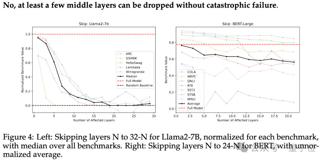 如下图4,在多个基准测试中,Llama2-7B和BERT-Large的性能均逐渐下降(图从左至右展示了跳过层数逐渐递增的变化)。这一结果揭示了: