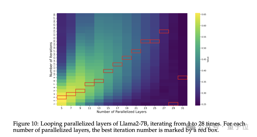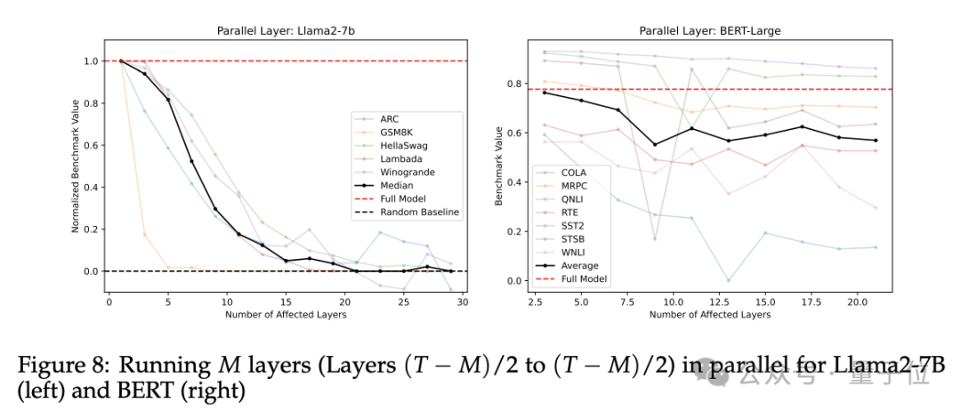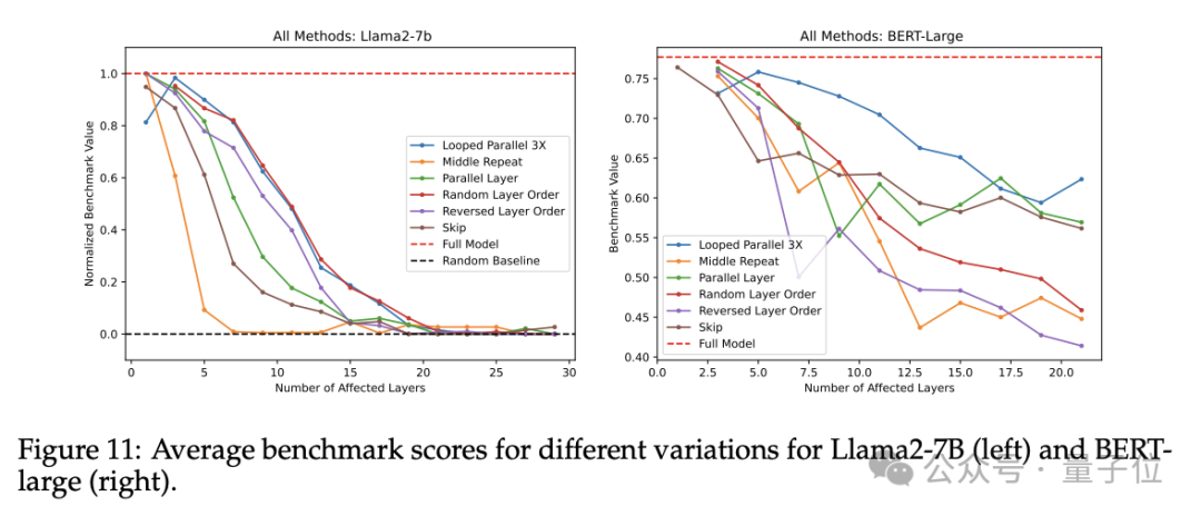 唯一的例外是在Llama2-7B的起始层N为15或BERT的起始层N为11时。在这种情况下,循环并行3次的效果相当于仅重复中间层3次,此时的并行层等同于完整模型。