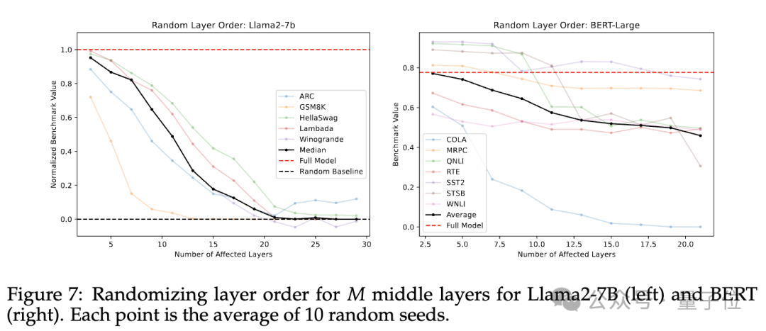 结果基准测试中,随着被替换的层数增加,模型性能迅速下降。而且性能下降速度比仅仅跳过某些层要严重得多,这种权重替换极具破坏性。