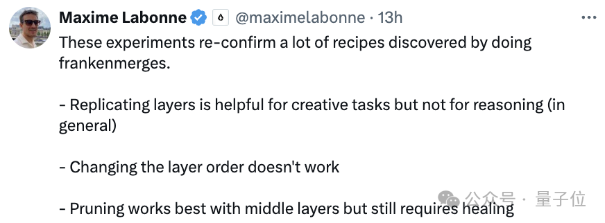 其中的实验再次证实了:复制层对创造性任务有帮助,但对推理任务通常无效;改变层的顺序行不通;剪枝在中间层效果最佳,但仍需要进行修复调整。